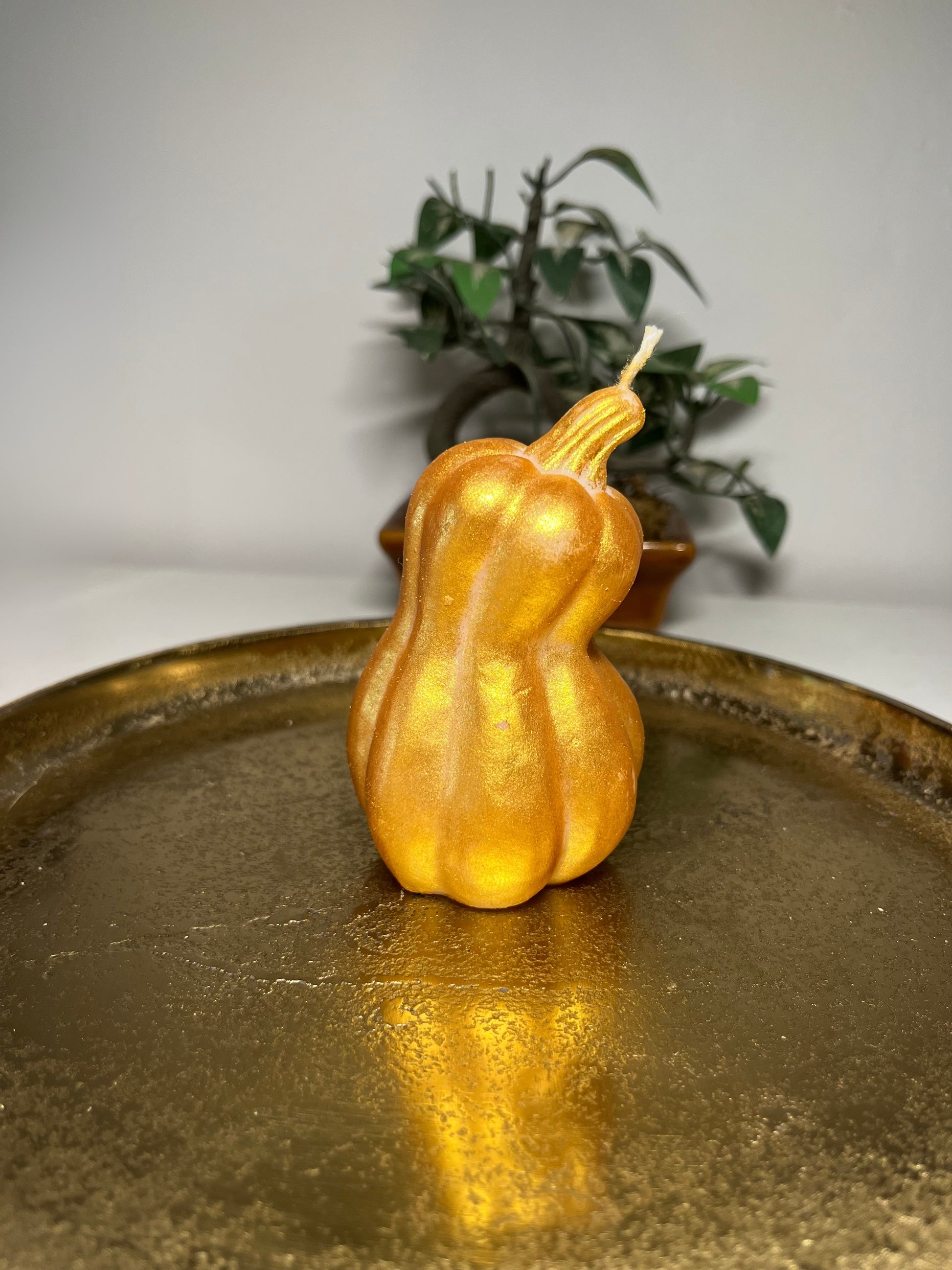 Ezzel az elegáns, arany színű tök formájú gyertyával azonnal meghitt, luxus hangulatot varázsolhatsz otthonodba. A kézzel öntött, részletgazdag forma az őszi dekoráció ékköve lehet – tökéletes választás ünnepi asztaldísznek, ajándéknak vagy egy nyugodt, gyertyafényes este kiegészítőjeként.