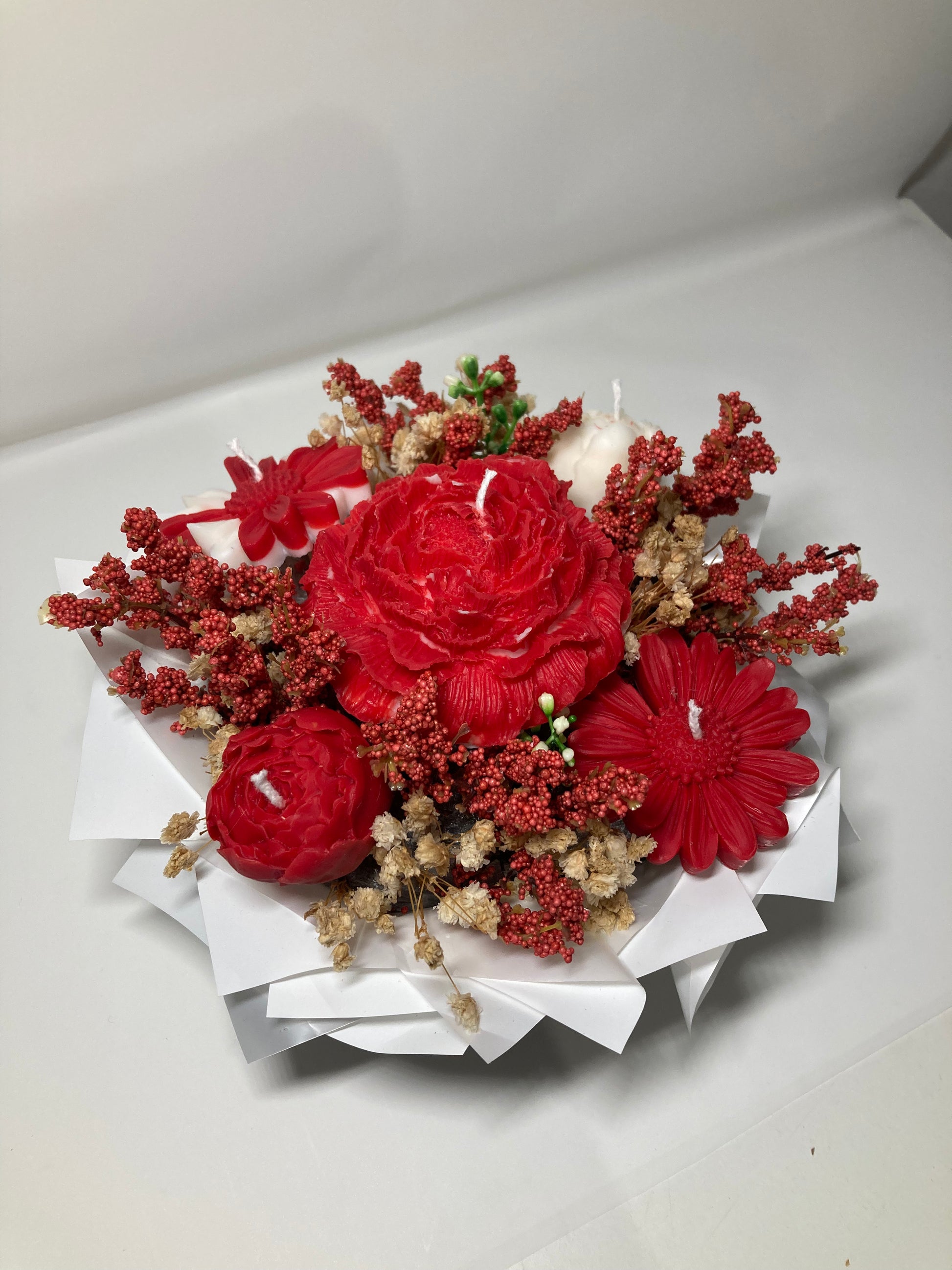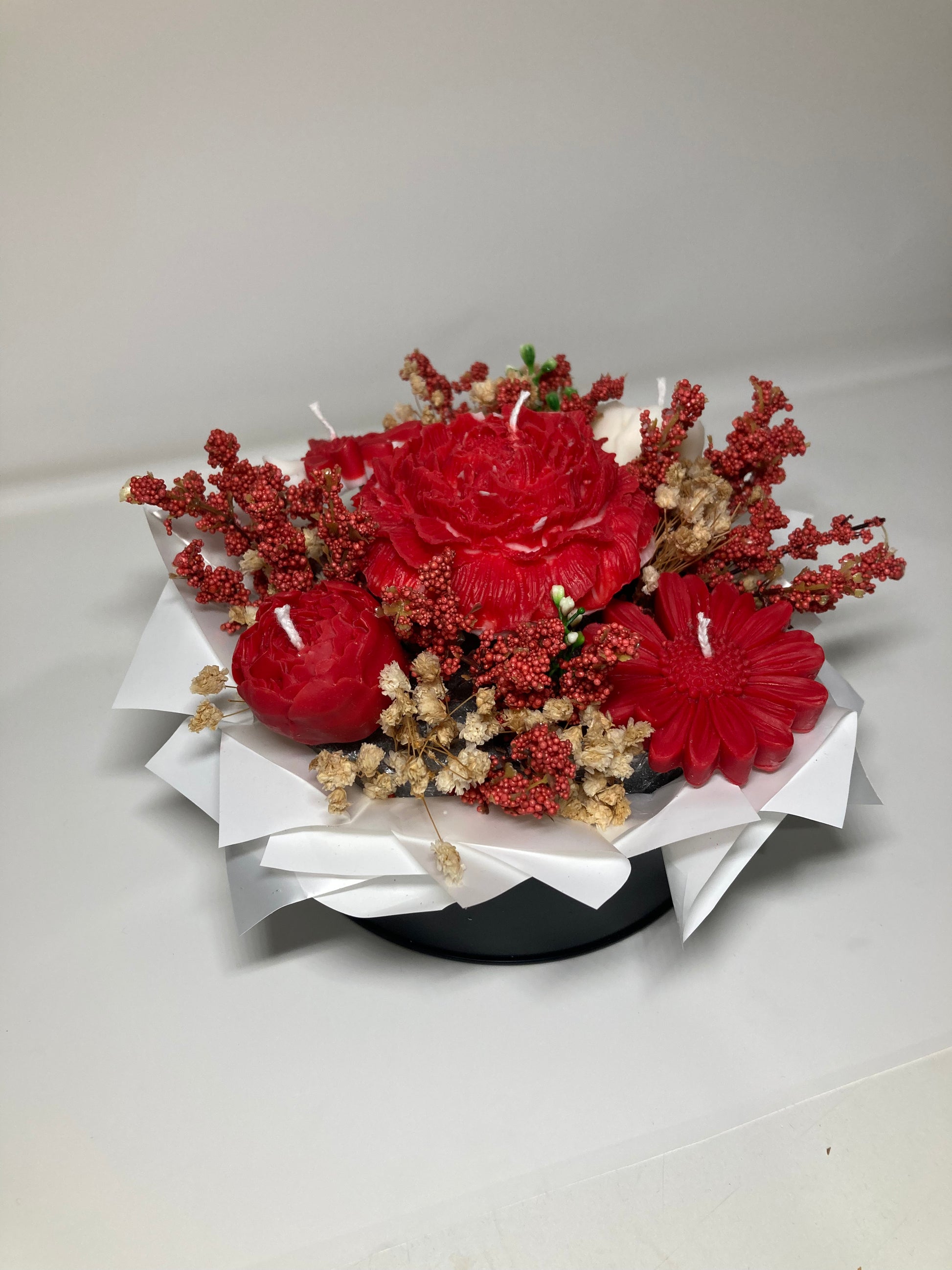 A szenvedély és természet ihlette ezt az intenzív vörös, barna és natúr árnyalatokból készült virágboxot, mely kizárólag kézzel öntött gyertyákból áll. Elegáns és különleges ajándék lehet szerelmesek napjára, születésnapra vagy évfordulóra. A dobozban megtalálható virágok – rózsa, gerbera, bazsarózsa formájában – mind paraffinmentes, kézzel készült gyertyák.